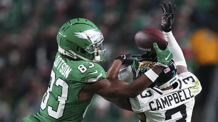 As a third option behind A.J. Brown and DeVonta Smith, Dotson failed to flourish here. In 34 regular-season games, he had 37 catches for 478 yards and one TD. In four postseason games, he had four catches for 83 yards and a touchdown. He had a pair of receptions in Super Bowl LIX.